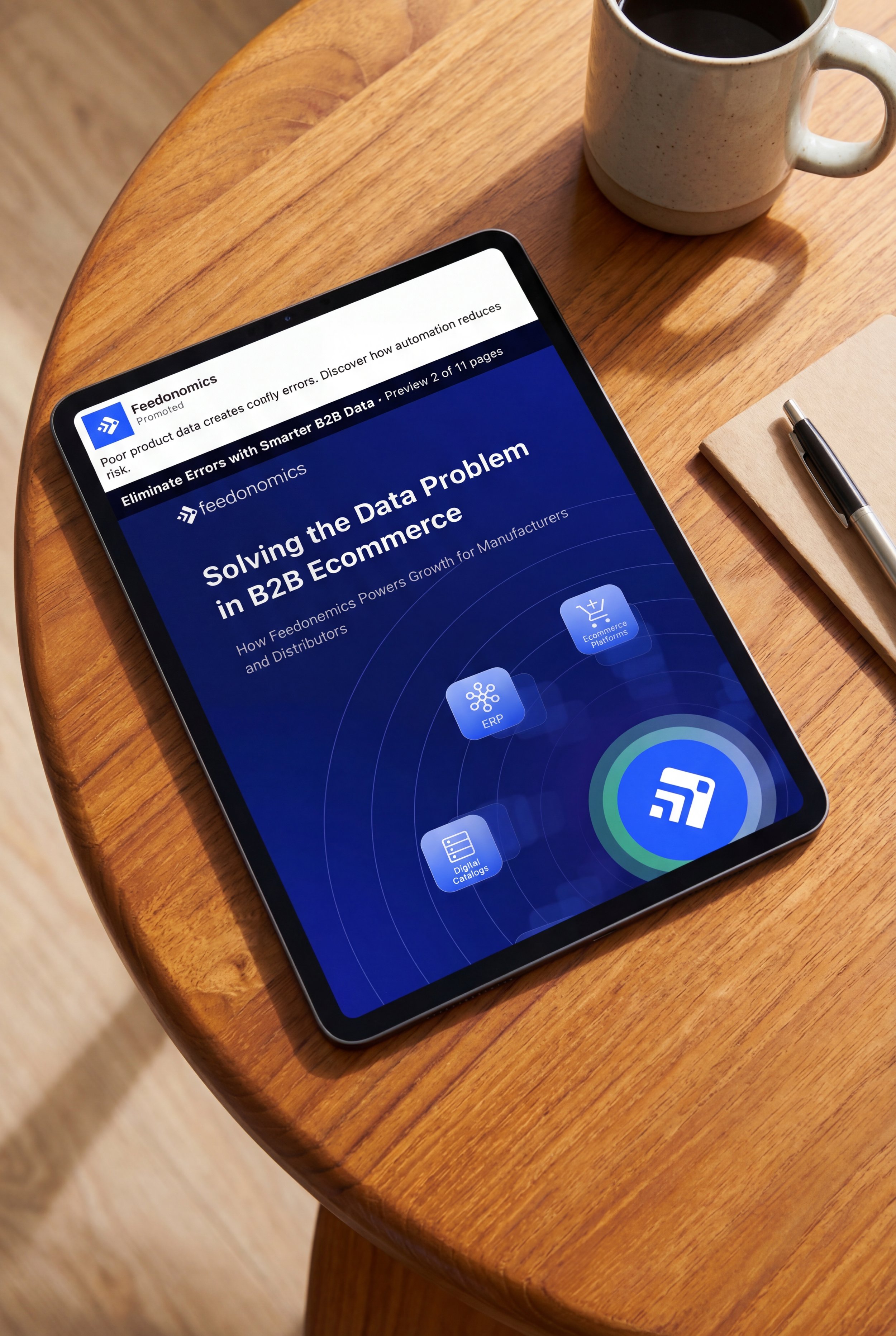 Paid LinkedIn document ad written for Feedonomics to promote a gated whitepaper on modern B2B product data strategy for manufacturers and distributors.