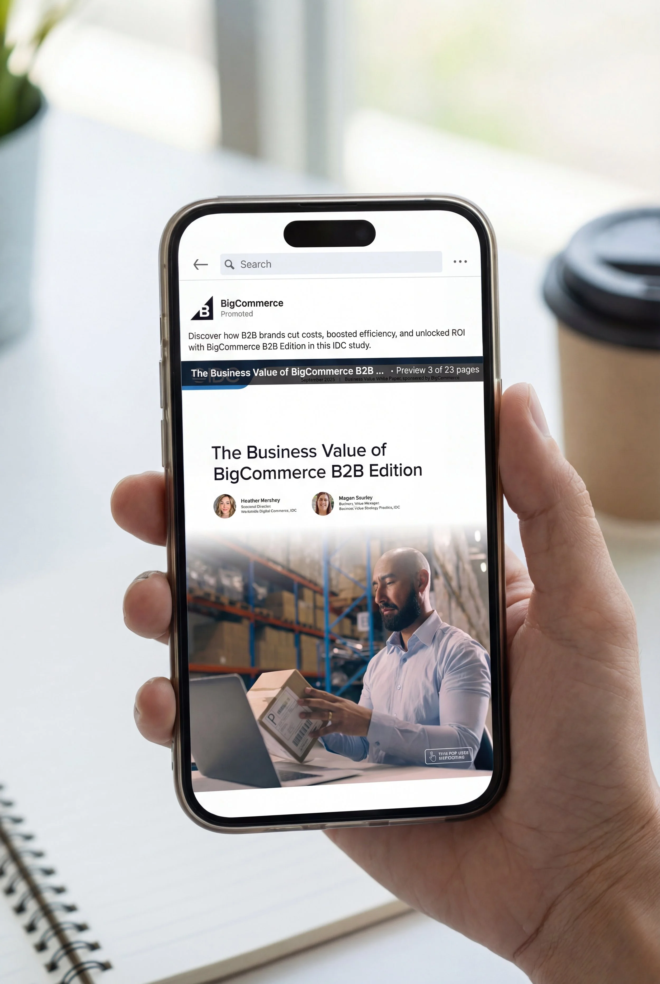 Paid LinkedIn document ad written for BigCommerce to promote The Business Value of BigCommerce B2B Edition, an independent IDC study quantifying ROI, cost savings, and operational efficiency for B2B brands.